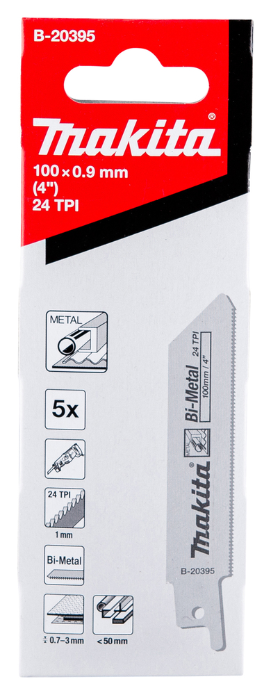 Reciprosaw blade for cutting metal. This Bi-Metal blade has an overall length of 100mm and a working length of 80mm. Blade is 0.9mm thick and has 24 TPI. Pack contains 5 blades.