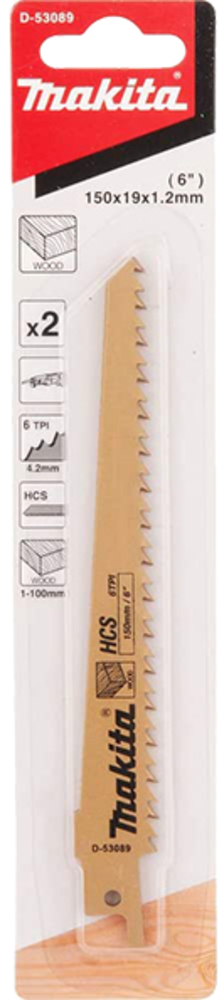Reciprosaw blade for cutting wood. This high carbon steel blade has an overall length of 150mm and a working length of 131mm. Blade is 1.2mm thick and has 6 TPI. Pack contains 2 blades.