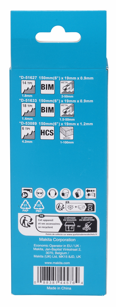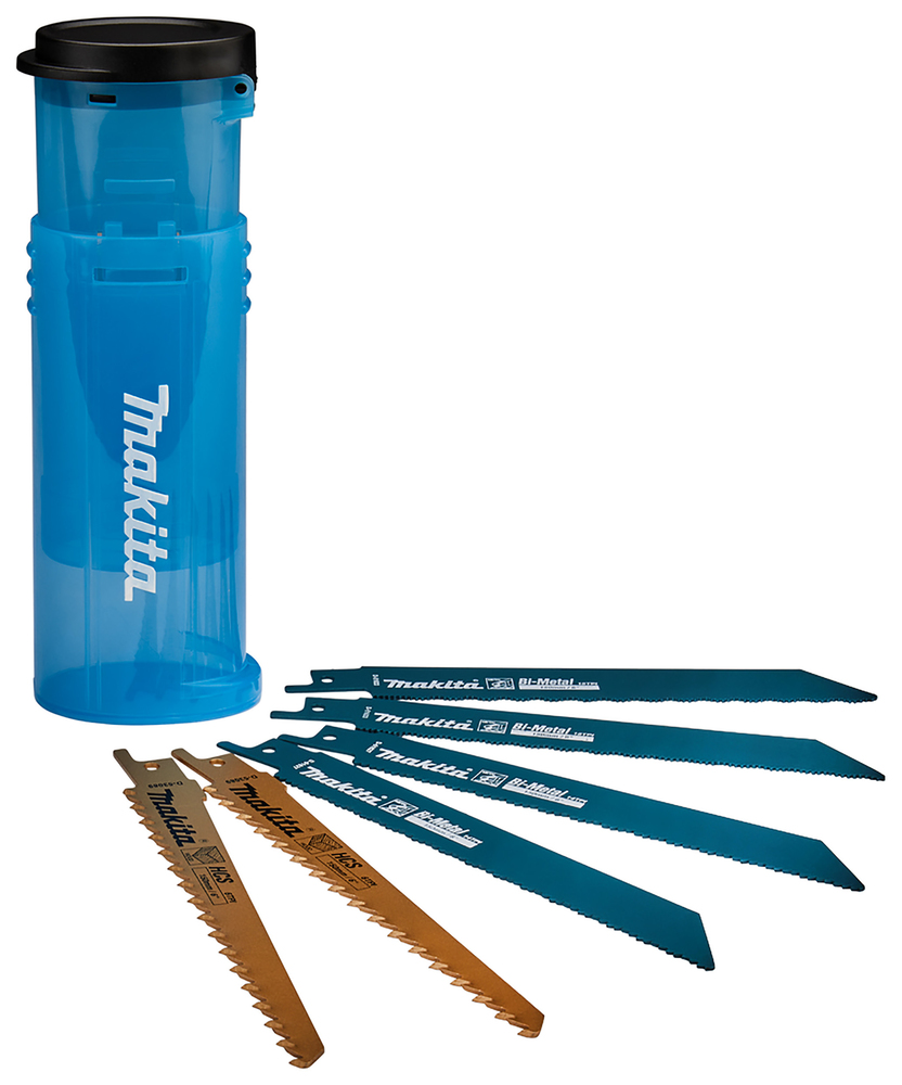 Set of reciprosaw blades in a plastic case includes separate blades for multiple materials such as wood and metal. The blades have overall length of 150mm and a working length of 128-131mm. Pack contains 6 blades. 2 x D-51627, 2 x D-51663, 2 x D-53089.