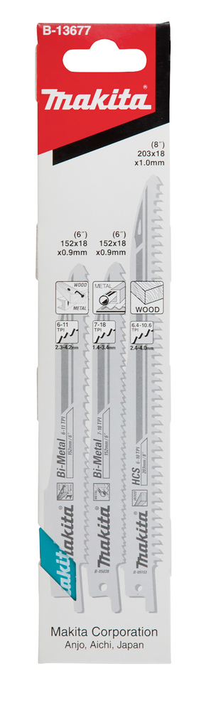 Set of reciprosaw blades includes separate blades for multiple materials such as wood, metal and PVC. The blades have overall length of 152-203mm and a working length of 130-180mm. Pack contains 3 blades. B-05038, B-05044 and B-05153.