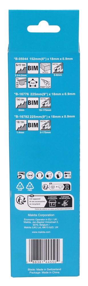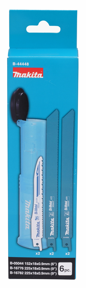 Set of reciprosaw blades in a plastic case includes separate blades for multiple materials such as wood and metal. The blades have overall length of 152-225mm and a working length of 130-205mm. Pack contains 6 blades. 2 x B-16782, 2 x B-16776, 2 x B-05044