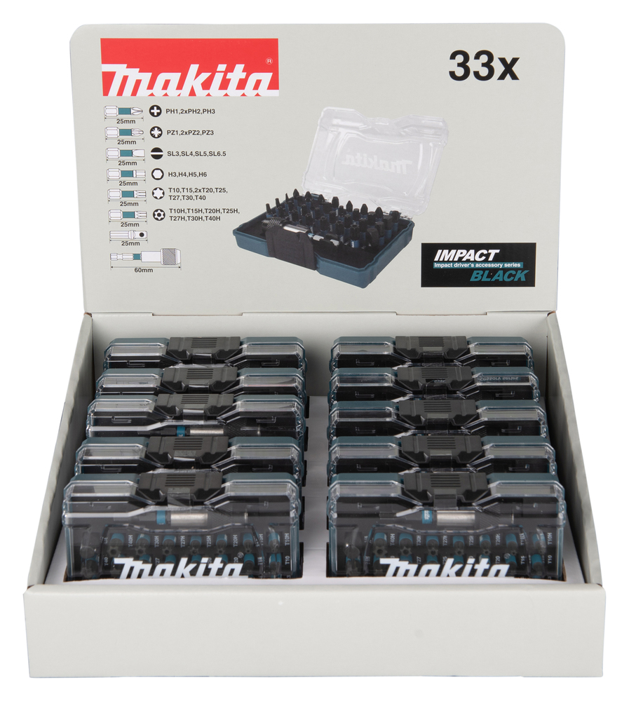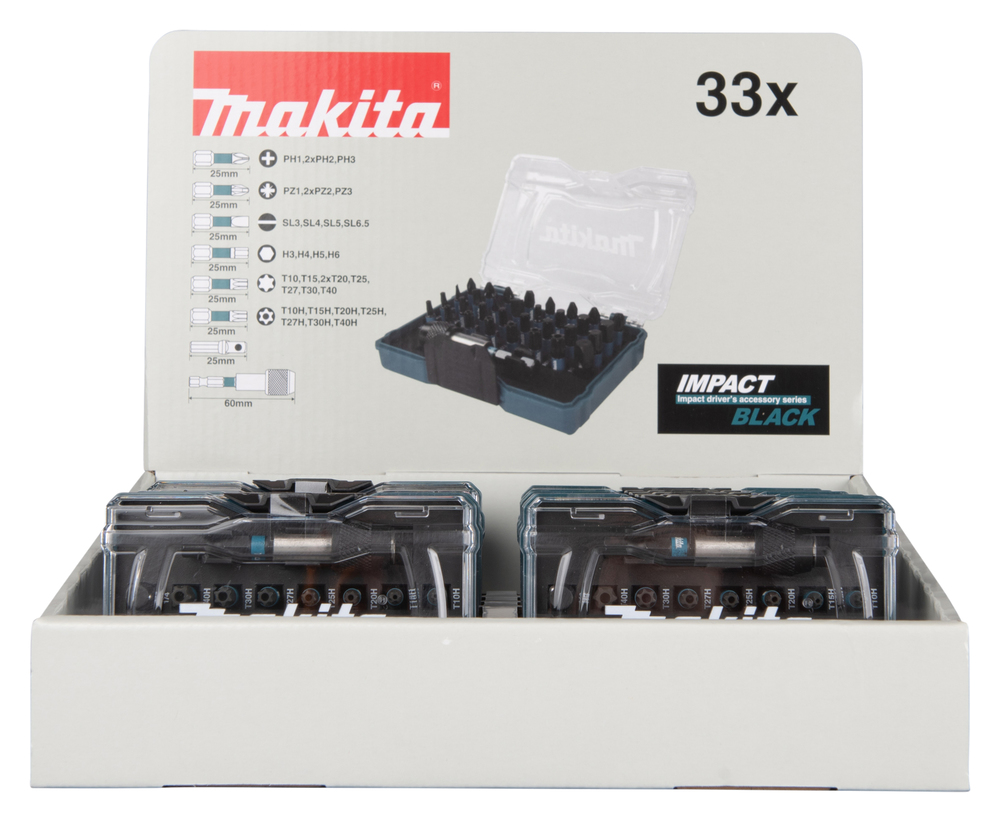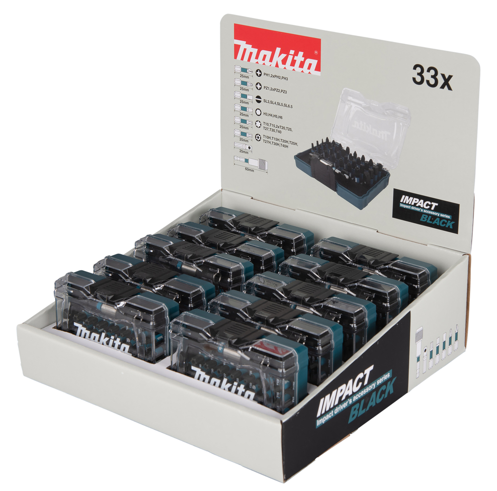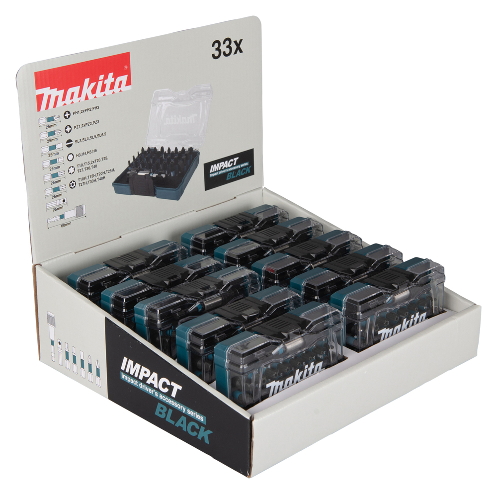 Impact Black 33 piece screw bit set for drivers. Set includes 31 Impact Black screw bits, sleeve chuck bit holder and socket adapter. Pack of 10 sets in a countertop display stand.