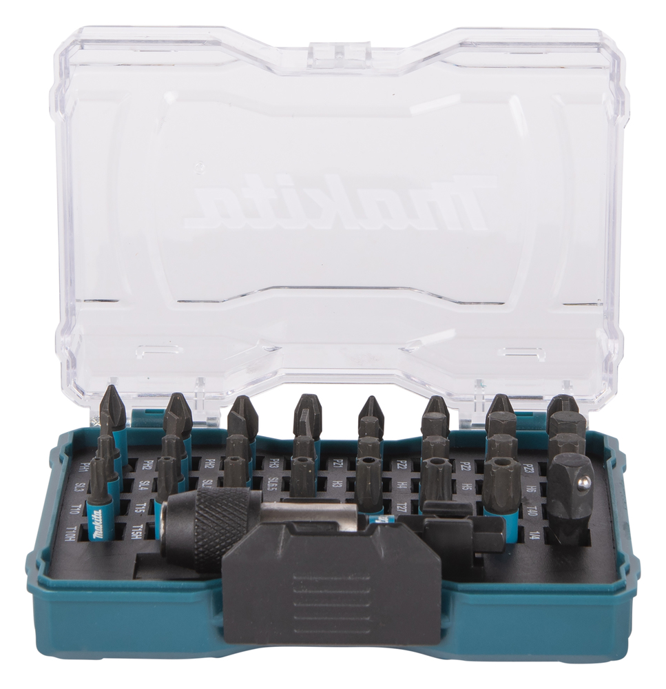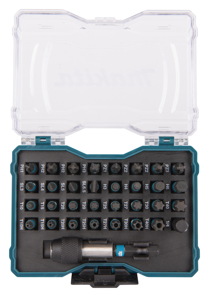 Set Contains: PH1, 2x PH2, PH3, PZ1, 2x PZ2, PZ3, SL3, SL4, SL5, SL6.5, T10, T15, 2x T20, T25, T27, T30, T40, T10H, T15H, T20H, T25H, T27H, T30H, T40H, H3, H4, H5, H6, 1/4″ Hex Socket Adaptor 25mm, 1/4″ Hex Sleeve Chuck Bit Holder 60mm