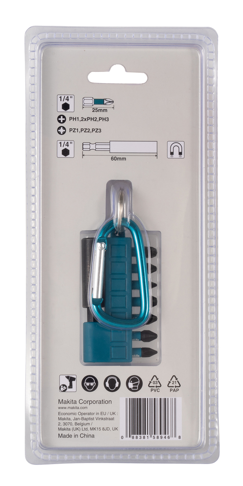 Screw bit set for drivers. Set contains Impact Black bits with length of 25mm (PH1, 2 x PH2, PH3, PZ1, PZ2, PZ3) and magnetic holder with length of 60mm. 8 piece set with a keychain case.