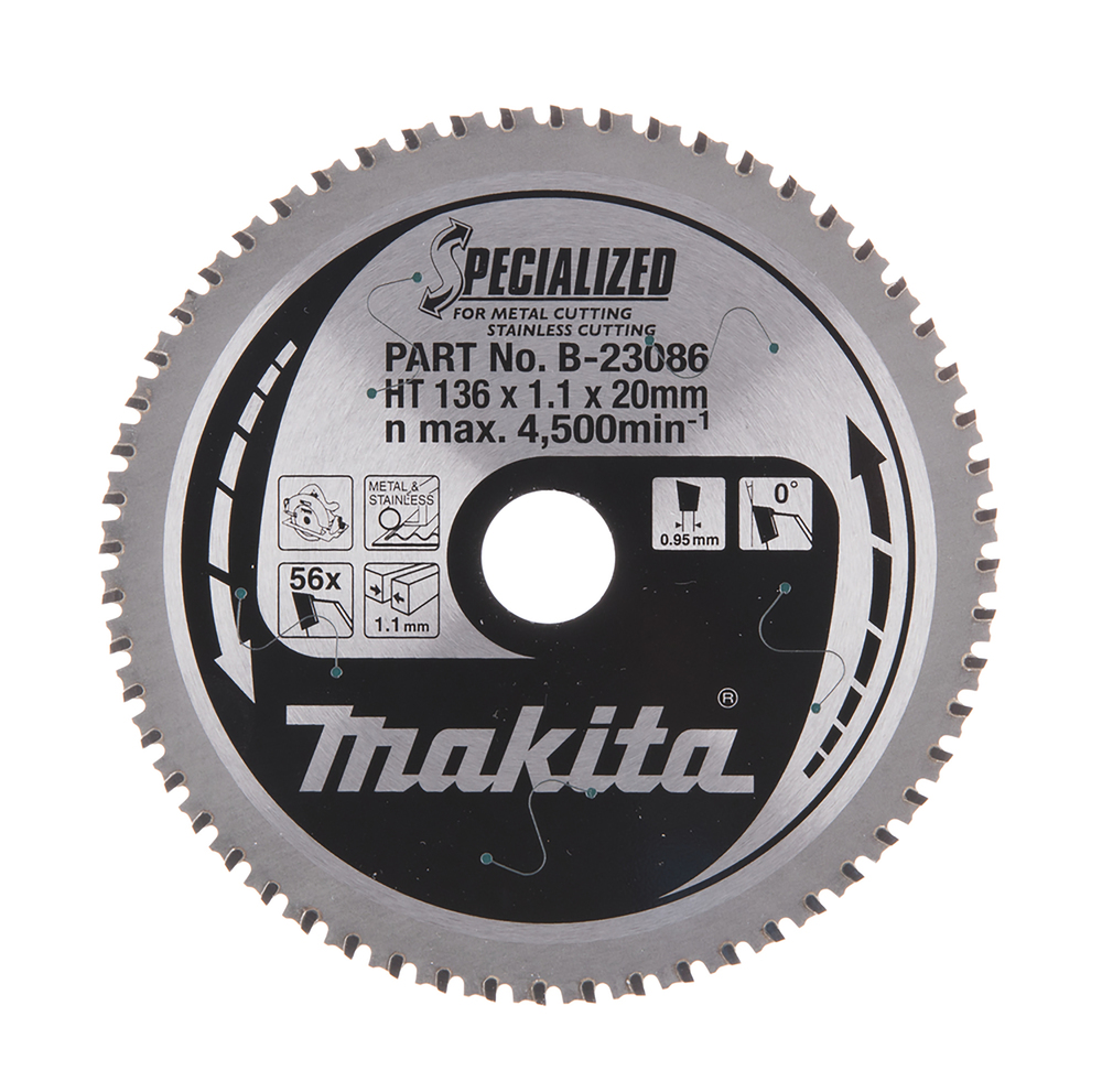 SPECIALIZED saw blade with 136mm diameter for cutting metal and stainless steel. The blade has 56 tungsten carbide tipped teeth, a kerf of 1.1mm and hole diameter of 20mm. Package includes 10 pieces.