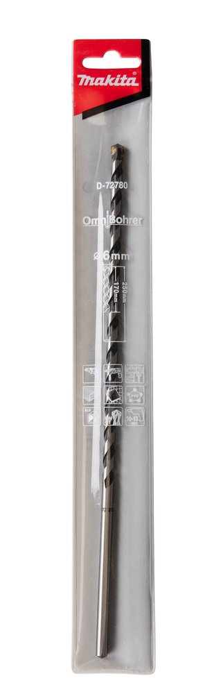 Omnibohrer multipurpose TCT drill bit with straight shank. Suitable for wood, brick, concrete, aluminium etc. (not recommended for aluminium when tungsten carbide tip is worn – always use new bits for aluminium) Size: 6x250mm