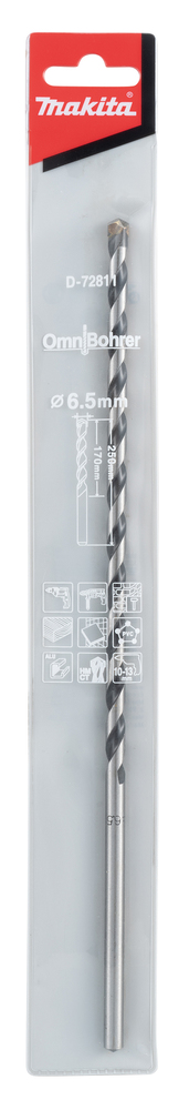 Omnibohrer multipurpose TCT drill bit with straight shank. Suitable for wood, brick, concrete, aluminium etc. (not recommended for aluminium when tungsten carbide tip is worn – always use new bits for aluminium) Size: 6.5x250mm