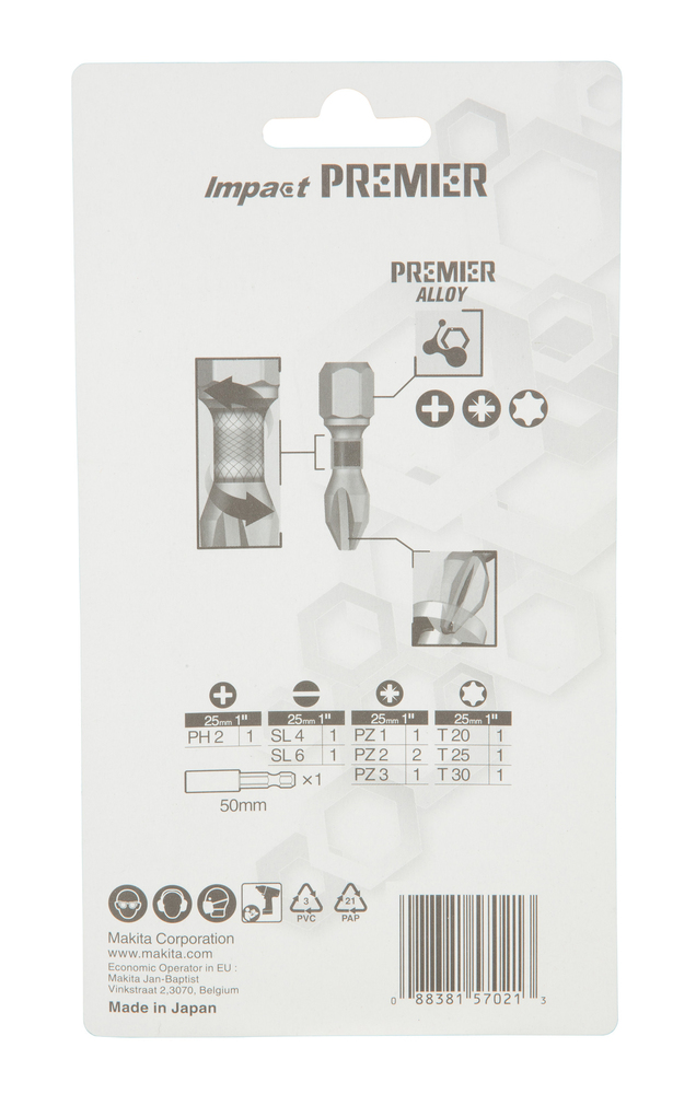 11 piece screw bit set for drivers. The set contains 10 torsion screw bits with length of 25mm (PH2, PZ1, 2 x PZ2, PZ3, SL4, SL6, T20, T25, T30) and 1 magnetic bit holder 50mm. Total of 11 pieces in a plastic case.