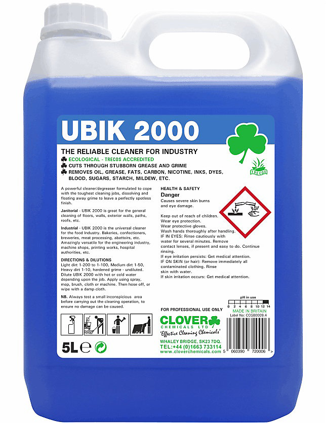 A universal cleaner and degreaser concentrate, designed to dissolve and float away the toughest grime and leave a spotless finish. This powerful, blue, alkaline cleaner and degreaser, designed to perform quickly in order to maintain hygiene in food environments. Ideal for removing food oils, fats, blood, dirt, industrial oils and grease from a multitude of surfaces, including: concrete floors, industrial paintwork and painted floors, plastic walls and ceilings, ceramic tiles, plastic coatings, machinery and equipment, stainless steel and anti-slip floors Ubik 2000 boast numerous uses within the food industry; kitchens, bakeries, meat processors, food processors, confectioners, pie makers and snack manufacturers. 1 x 5 litres.