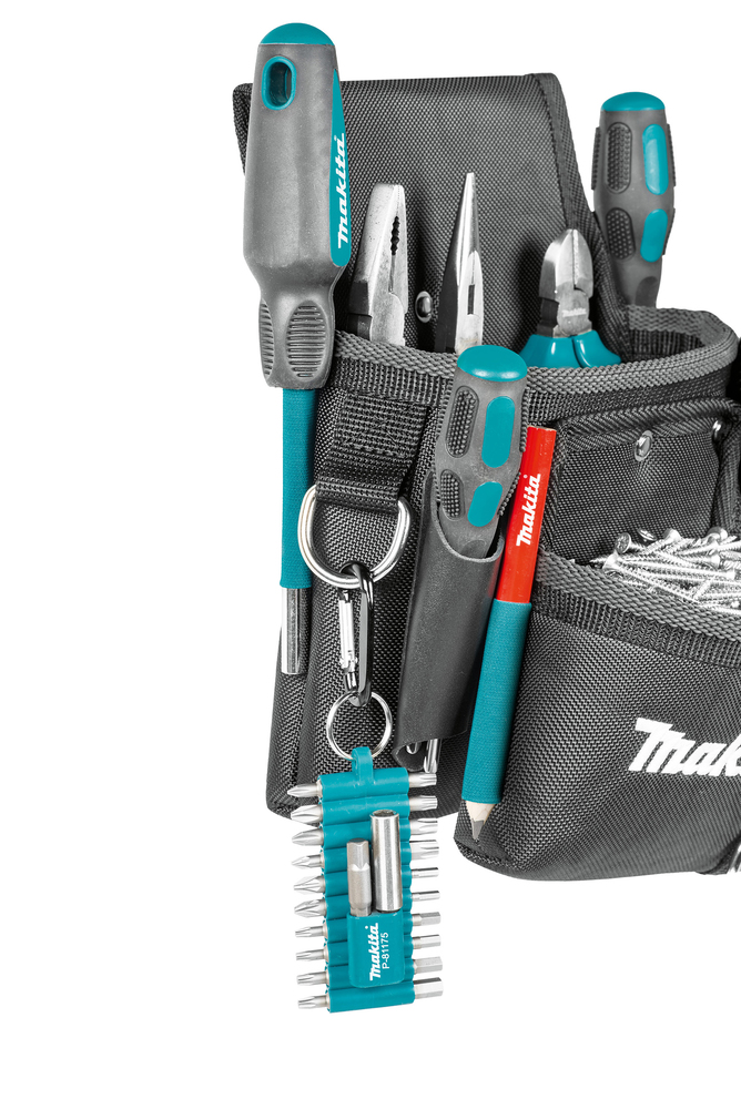 Main pocket has anti-slip webbing Real leather holders for screwdrivers and knives D-ring for hanging a variety of tools and accessories