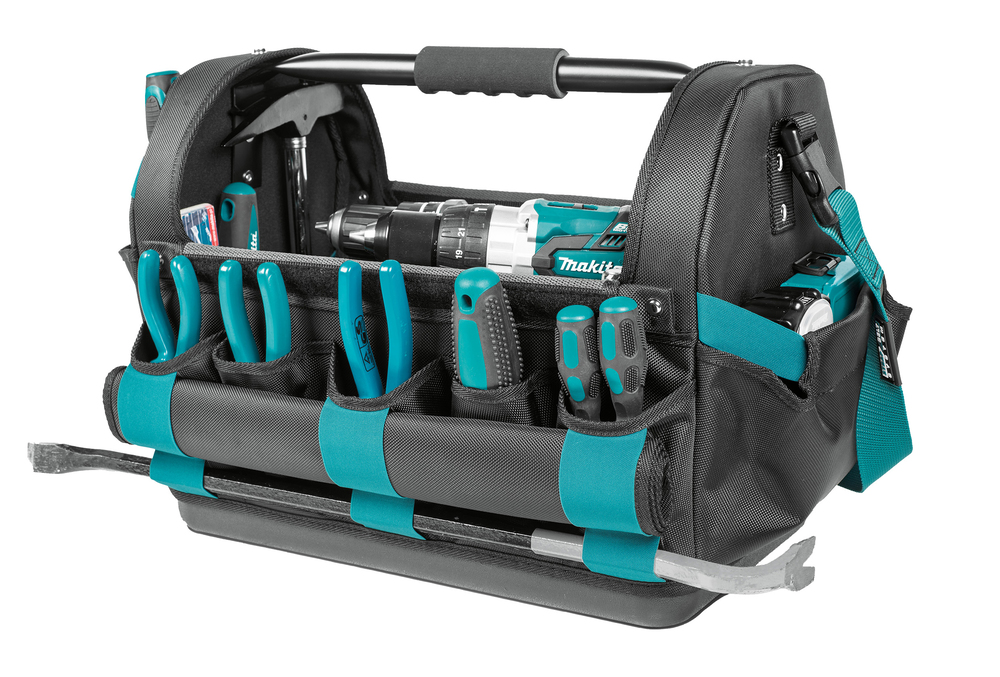 Sturdy covered tool tote Handy reinforced front pocket for hand saw Perfect organisation with both internal and external pockets Open design for quick and easy tool location Square shape provides extra stability 9 external pockets in a variety of sizes made from strong polyester 2 elasticated side pockets Front pocket for documentation 8 elastic loops and holders inside give greater flexibility 6 elastic loops on the back exterior for longer length tools Cover can be stored in rolled position Ergonomically shaped steel and foam handle Anti-slip Webbing