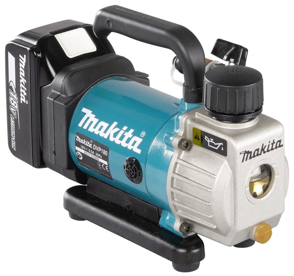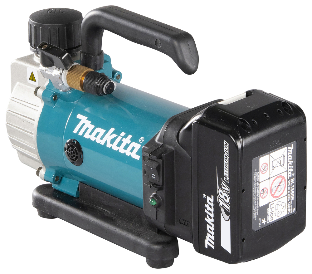 A cordless vacuum pump for easy air purge during installation of air conditioning units. Because of its small size, the pump is easily portable. Its run time with a 5.0Ah battery is up to 50 minutes.