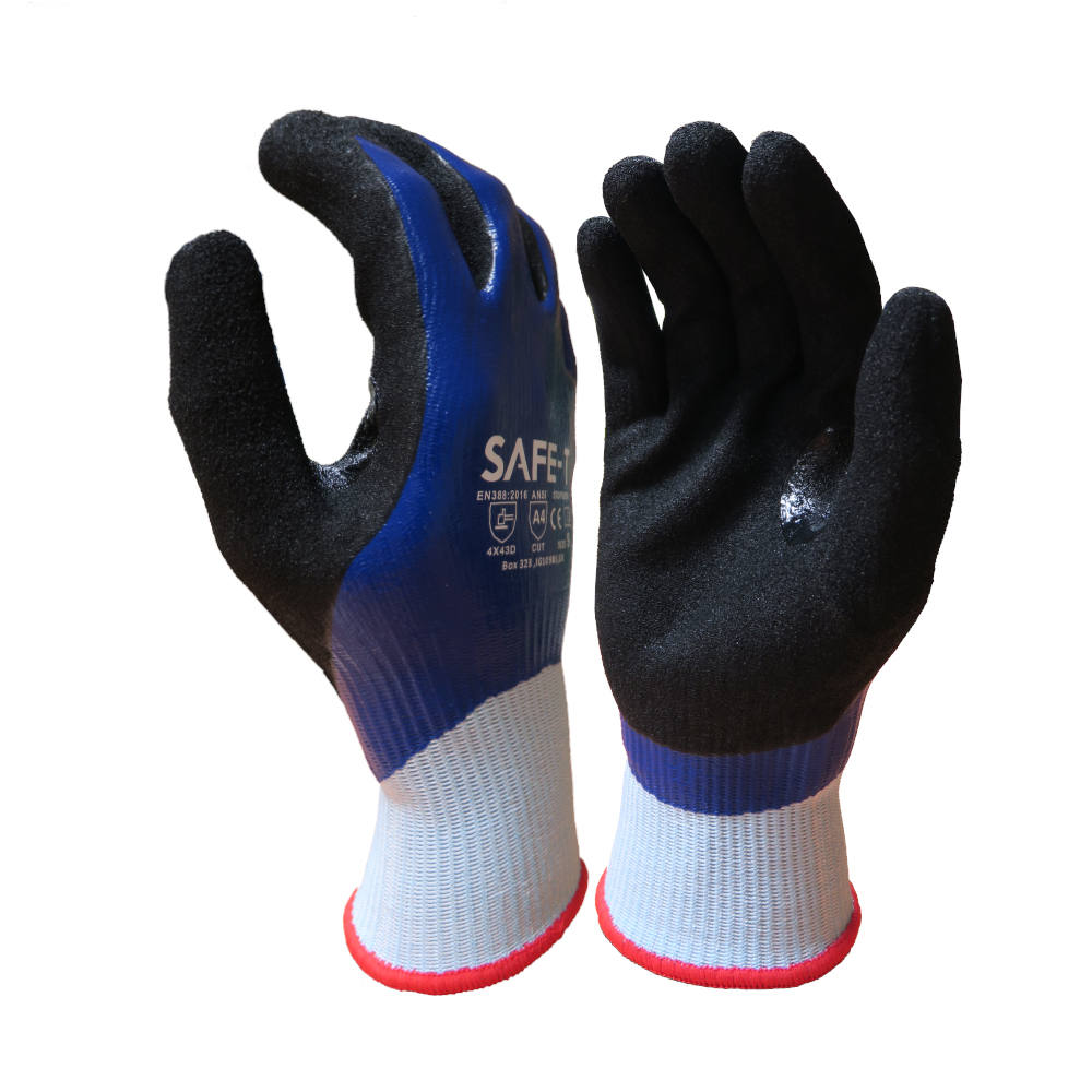 These reinforced nitrile gloves offer your workforce tremendous comfort and safety. 13G UHMWPE/glass fibre/steel/polyester/spandex liner with first full nitrile smooth plus second layer palm nitrile sandy finish coated. Providing nitrile at the thumb crotch. Fully coated glove providing high levels of protection. Suitable for Maintenance, Forestry, Building, Construction, Outdoor work, Ceramics, Handling tasks, Glass handling, Metal handling, Manual, Warehousing, Woodwork, Metal handling, Quarrying, Building, Construction and oil industry. Conforms to EN ISO 21420:2020 and EN 388:2016 + A1: 2018 4 X 4 3 D. Grey / Black. 12 pairs of size 9 waterproof cut resistant gloves.