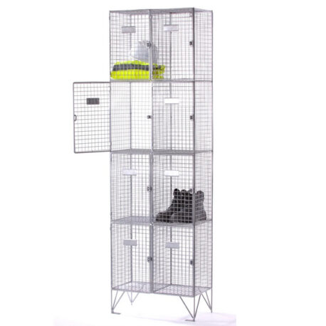 Our Wire Mesh 8 Compartment Lockers are perfect for environments where high ventilation and full visibility is required. they are very popular in water sports as wet suits, life jackets and other equipment can dry and drain properly whilst being secure at the same time. Also ideal for workplaces where clothing comes into contact with strong odours, fumes and dust will benefit from have mesh lockers to securely air these items out. Mesh personal lockers. Finished in electroplated bright zinc. Each locker is manufactured from 25mm x 25mm x 2.5 weld mesh. 8mm rod frame. Mesh personal lockers come with hasp and staple lock for use with padlock. Each locker can be nested back-to-back or side by side and come complete with floor fixing brackets. 15cm high legs as standard. 198cm x 61cm x 30.5cm.